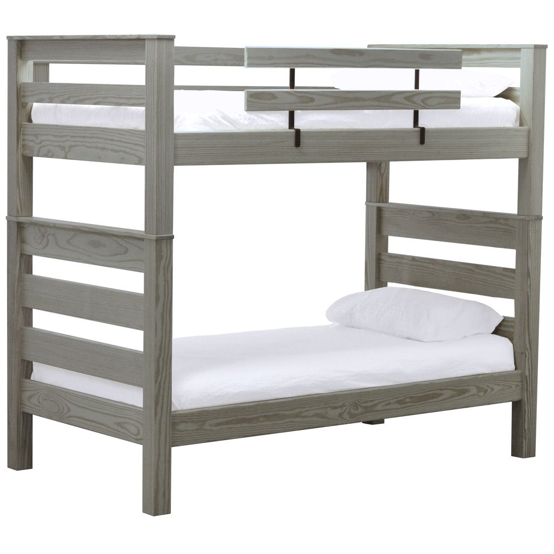 TimberFrame bunk beds feature massive corner posts with thick ladder rungs in between using mortise and tenon construction. A removable guardrail is included on the front with a full-length guardrail at the rear of the upper bed. Add optional drawers or a trundle bed for maximum use of your floor space. Ready for a mattress, no foundation required. The top of an 8” thick mattress on the lower bed will be 21” and on the upper bed will be 64” off the floor. All bunk beds and beds have been tested to accommodate over 450 pounds and are recommended for adult use.