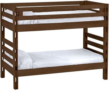 TimberFrame bunk beds feature massive corner posts with thick ladder rungs in between using mortise and tenon construction. A removable guardrail is included on the front with a full-length guardrail at the rear of the upper bed. Add optional drawers or a trundle bed for maximum use of your floor space. Ready for a mattress, no foundation required. The top of an 8” thick mattress on the lower bed will be 21” and on the upper bed will be 64” off the floor. All bunk beds and beds have been tested to accommodate over 450 pounds and are recommended for adult use.