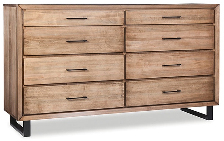 Odyssey transitional dresser in desert sand finish. Has a matte black base, and soft close drawers.Read More