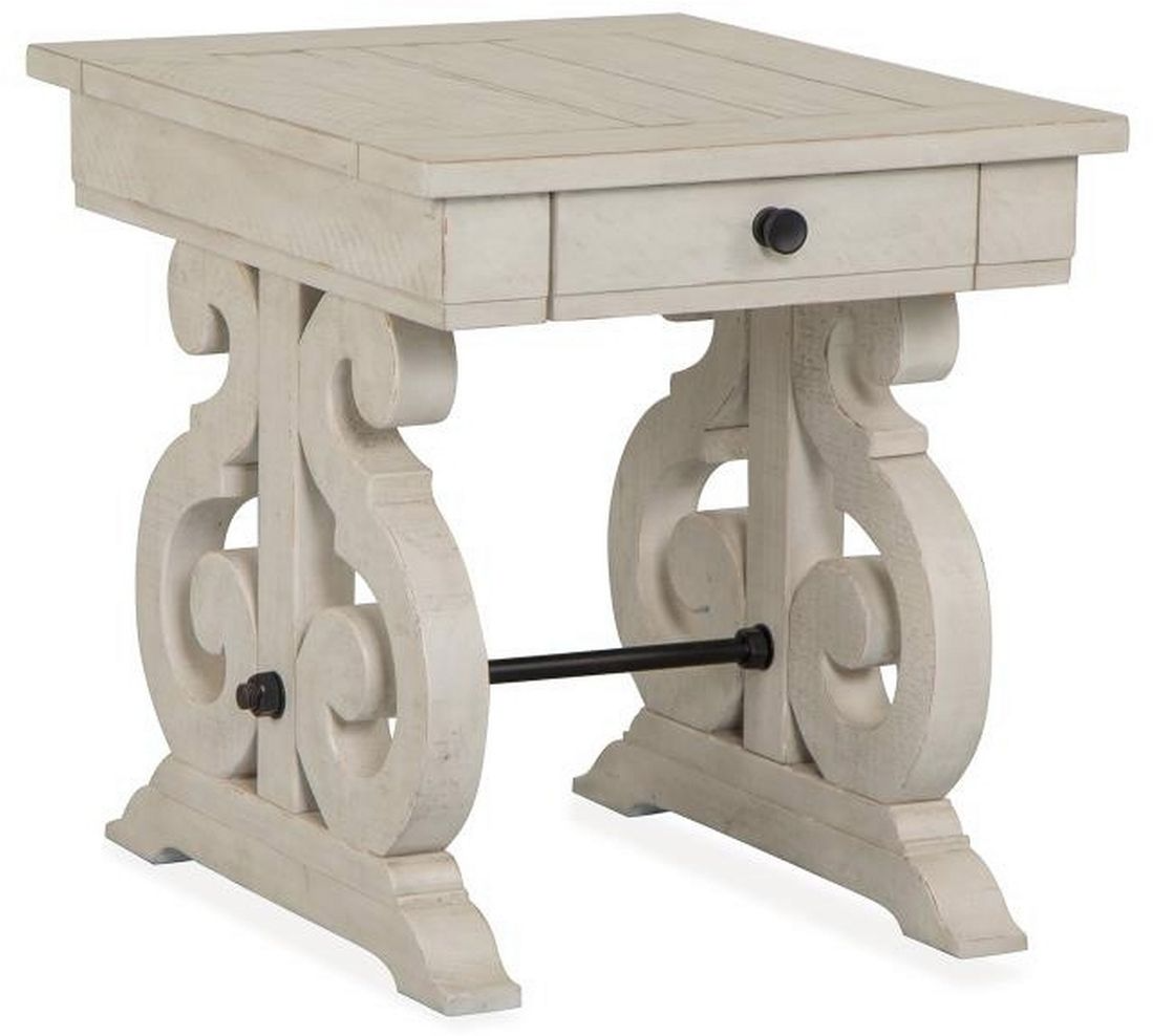 An unforgettable addition to any space, the Bronwyn table collection conveys sophisticated charm. Elegant scrollwork-inspired legs translate a timeless design motif into a stylish aesthetic perfect for today’s homes. Planked tops distinguish Bronwyn’s tabletops and are brought to life in a fresh, clean Alabaster finish accented by hardware in Antique Brass with a Pewter overlay. Shelves and storage drawers make it easy to keep living spaces organized while each table offers its own distinctive personality.