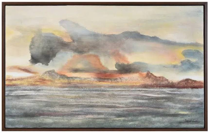 This work of art is expansive in size and character. This hand-painted cotton canvas brings the meditative feel of staring out to sea right into the traditional interior space. The dark brown floating frame acts as a rich accent that grounds the soft hues of blue and beige.Read More